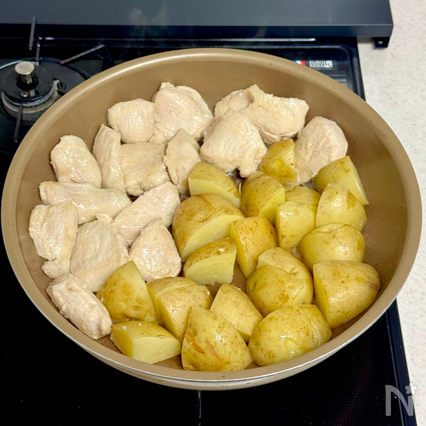 (3) フライパンにサラダ油をひき中火にかけ、鶏むね肉を焼く。色が変わったらじゃがいもを加え、焼き色がつくまで炒める。