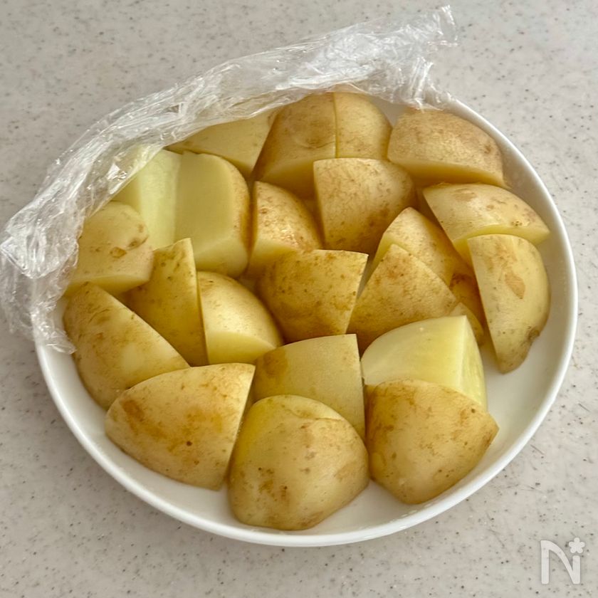 (2) 新じゃがいもは皮付きのまま洗い、ひと口大に切る。耐熱皿に並べてふんわりラップをかけ、600Wで4〜5分、竹串がすっと通るまで加熱する。