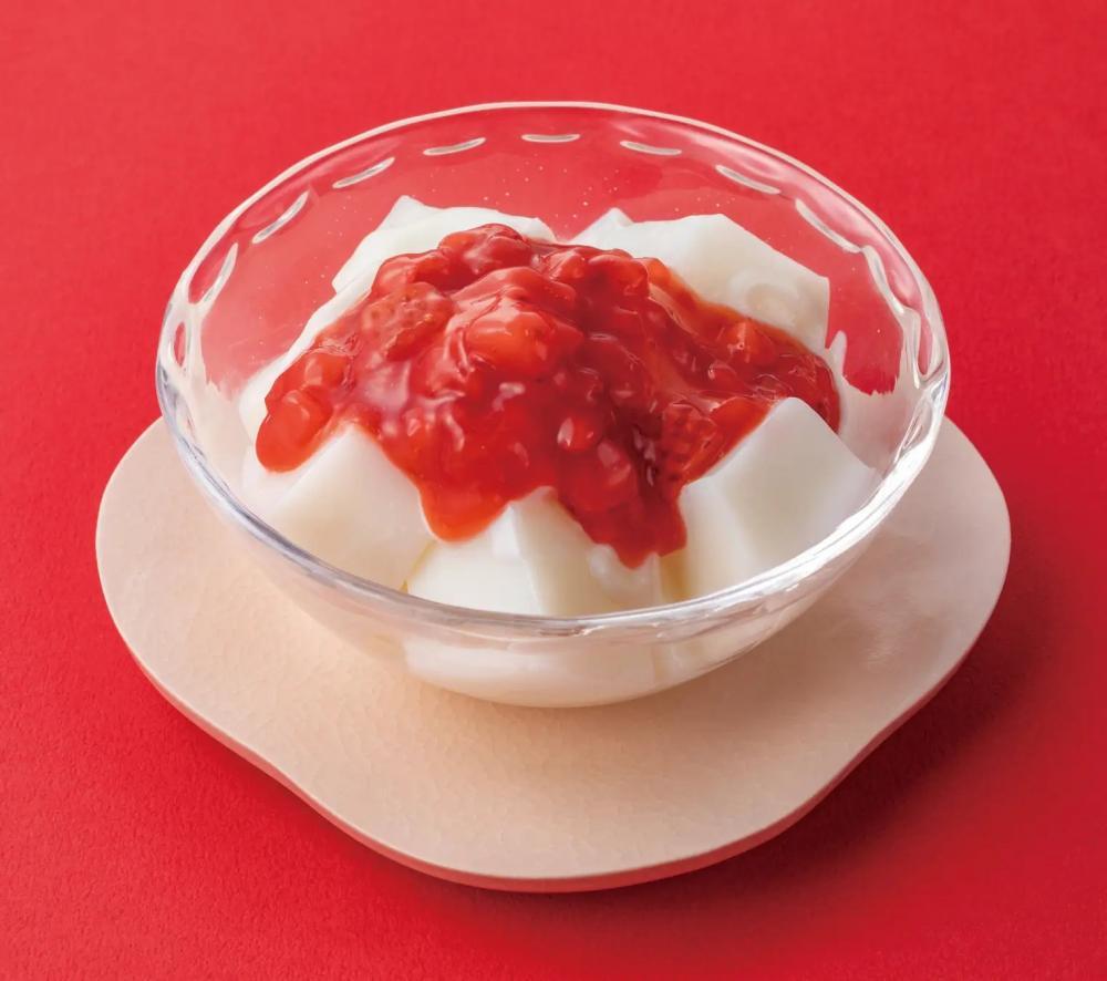練乳入りのもっちりわらびに果肉入りいちごソースと練乳ソースをかけた商品です。