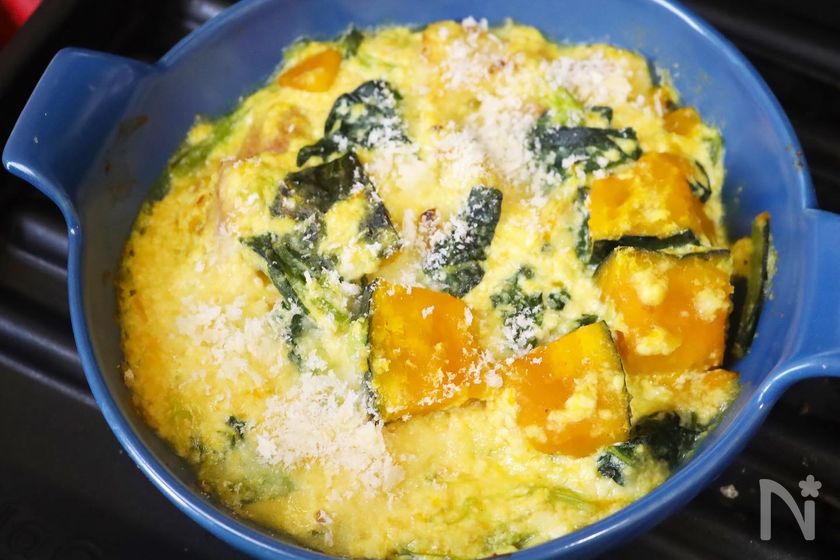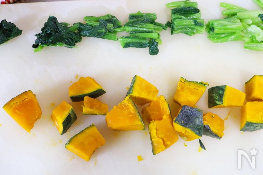 (2) 小松菜(またはほうれん草でも)は茹でて長さ3cm程度に切る。①のかぼちゃのタネとワタを取り除きひとくち大に切る。