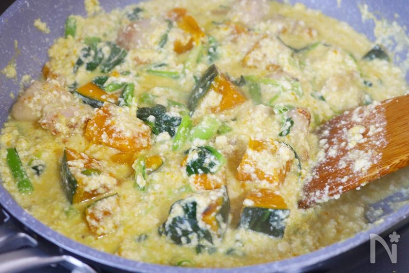 (6) ④の豆腐と②の小松菜、【B】を加えて混ぜ、とろけるチーズを加えてさらに混ぜる。