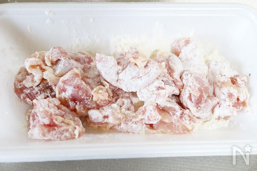 (3) 鶏もも肉は食べやすい大きさに切り、【A】を揉み込んで10分ほどおいたら、全体に小麦粉をまぶす。
