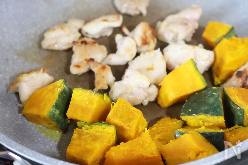 (5) 熱したフライパンに油(分量外)をしき、③の鶏肉を焼く。鶏肉に火が通ったらかぼちゃも加えて軽く炒める。