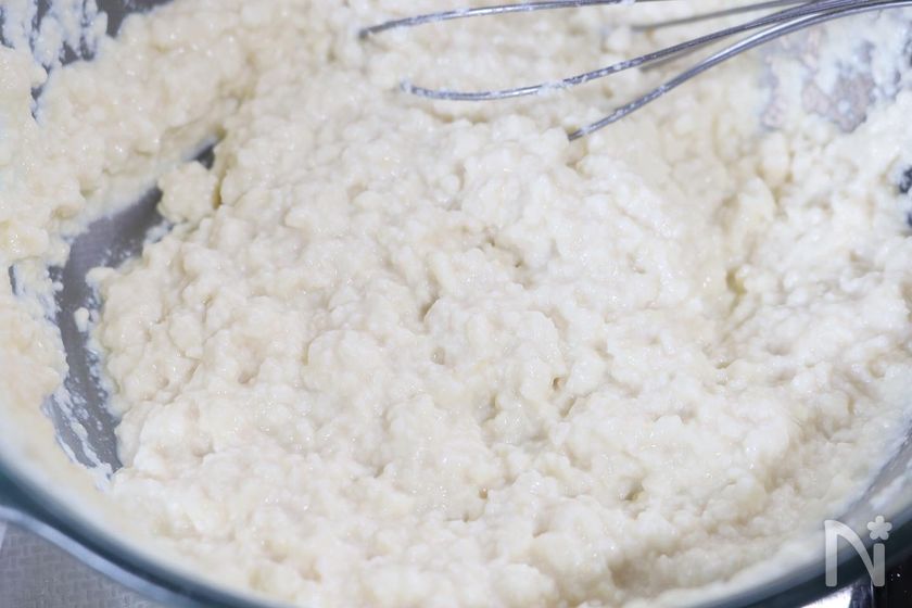 (4) 豆腐はボウルに入れ泡立て器などでよくほぐす。