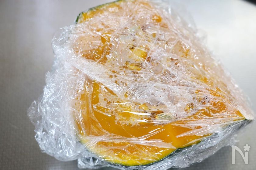 (1) かぼちゃは全体を濡らしてラップに包み、600Wのレンジで4〜5分柔らかくなるまで加熱する。