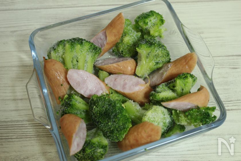 (1) 耐熱容器に冷凍ブロッコリーを入れ、斜め3等分に切ったウインナーを加える。