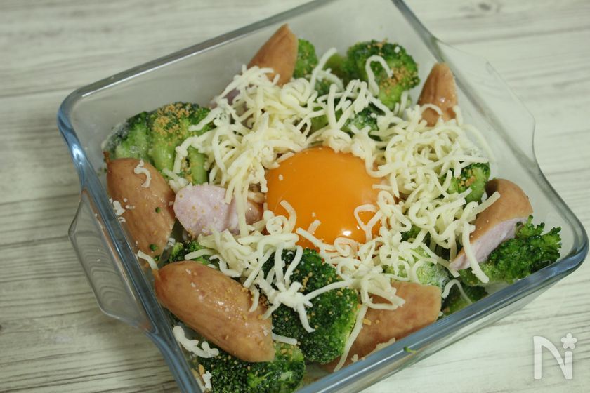 【レンジで簡単朝食】ブロッコリーとウインナーの巣篭もり卵