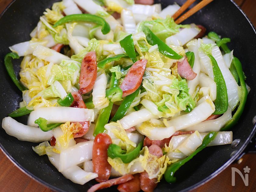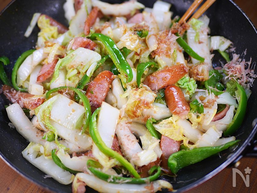 白菜の食べ方1位✨白菜とウインナーの生姜おかかポン酢炒め🤤