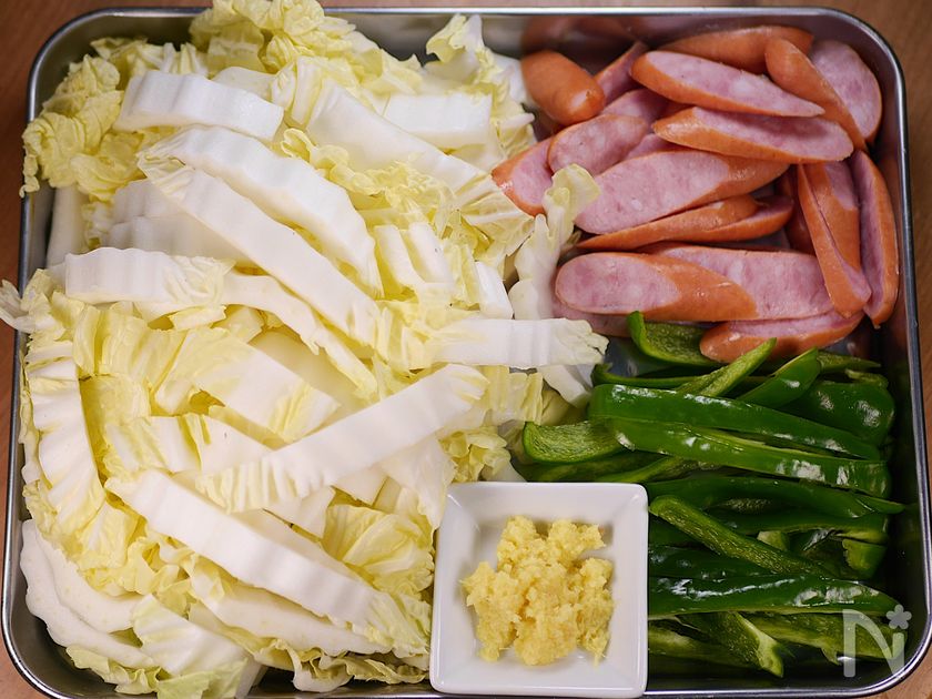 (1) ○白菜は繊維を断ち切るように1㎝幅のざく切りにする。