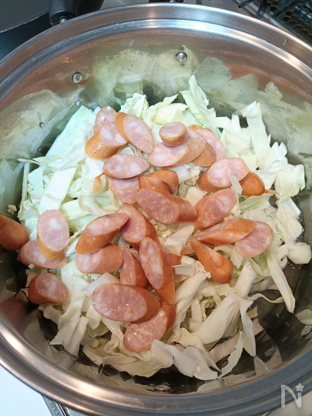 (2) 鍋に、1と水、コンソメ顆粒を入れ、蓋をして中火にかける。沸騰してから5分程煮て、キャベツが柔らかくなったら、器に盛る。黒こしょうをふったら完成。