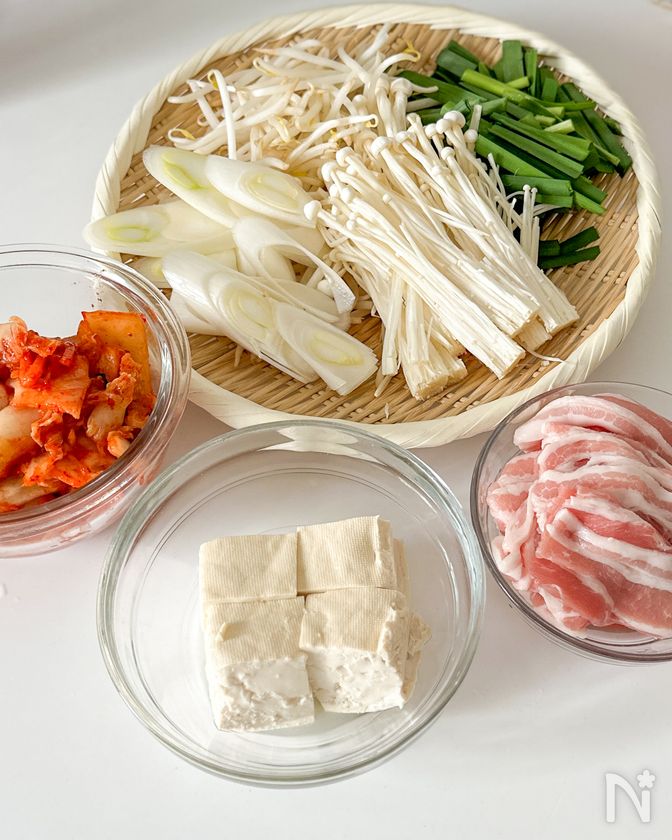 (1) 豚バラ肉薄切りは食べやすい大きさに切る。長ねぎは斜め切りにする。ニラは3cm幅に切る。えのき茸は根元を落とし、食べやすい大きさにほぐす。豆腐(絹)は食べやすい大きさに切る。