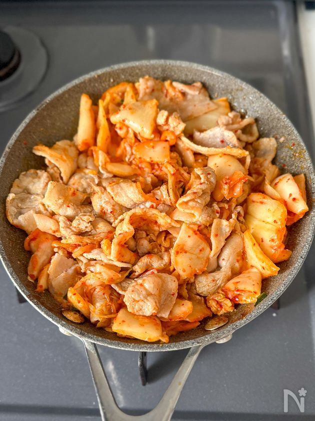 (2) フライパンにごま油をひき中火で熱し、豚肉を入れて色が変わるまで炒めたら、キムチ、おろしにんにくを加えたら全体に炒め合わせて火を止める。