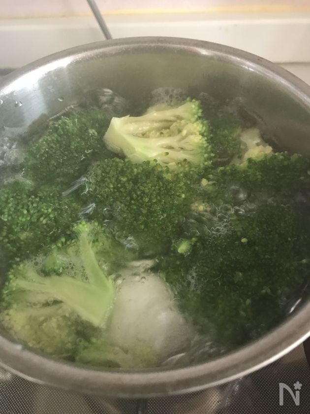 (下準備) ブロッコリーはさっと塩を入れた熱湯で茹でます。茹だったら、水で洗って水気を切っておきます。