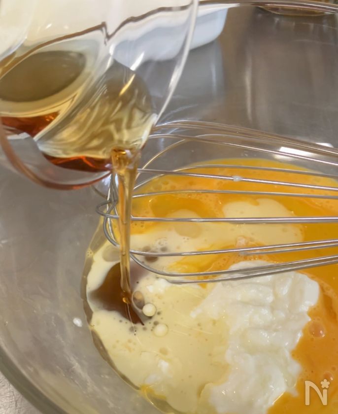 (1) ボウルに卵(M)を入れ、泡立て器で溶きほぐす。【A】を順に加え、混ぜる。