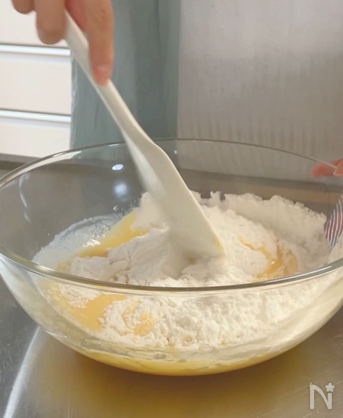 米粉とベーキングパウダーを入れたあとは、ゴムベラでさっくり混ぜるだけでOKです。混ぜすぎないのがふんわりのコツ。