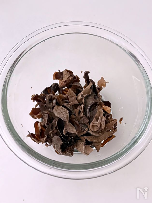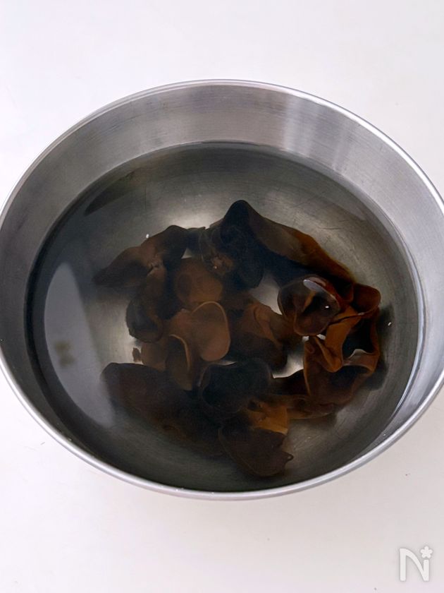 (下準備) きくらげを、40℃のぬるま湯に入れ、30分ほどおいて戻しておく。