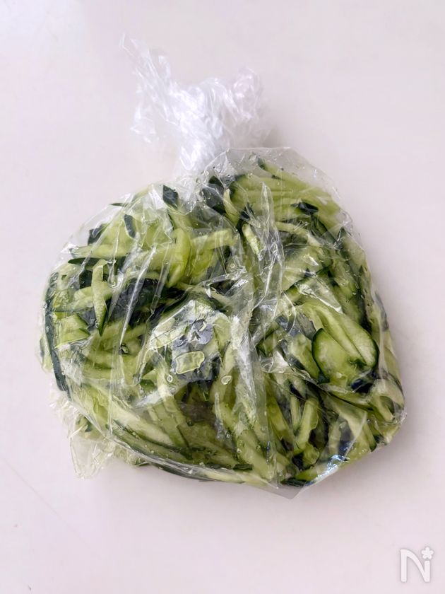 (1) きゅうりは、千切りにして、塩と共にポリ袋に入れ、よくもみ込み、そのまま5分ほどおき、水気をしぼる。