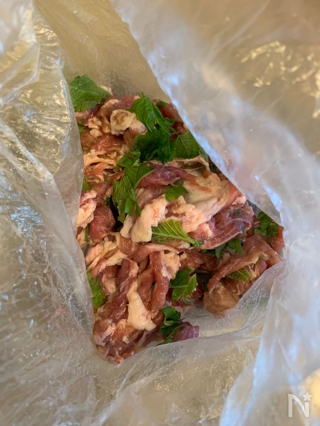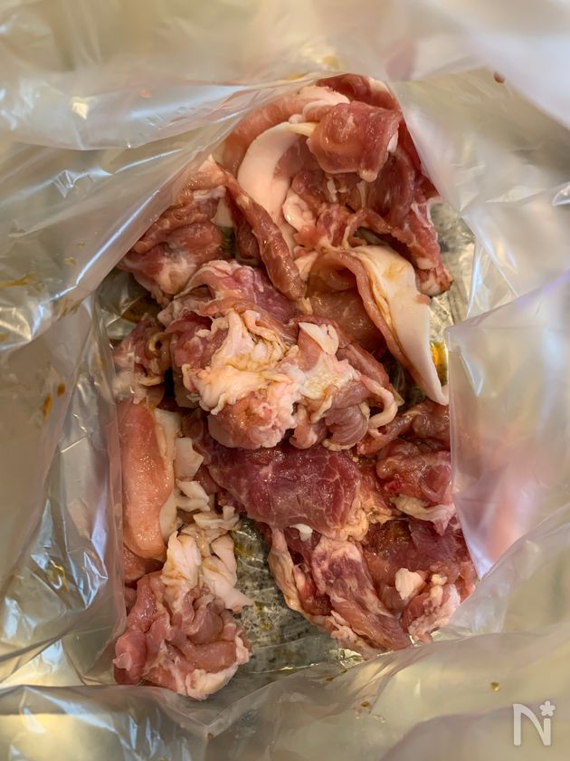(下準備) 保存袋に豚こま切れ肉【A】を入れて揉み込み10分ほど冷蔵庫で置く。