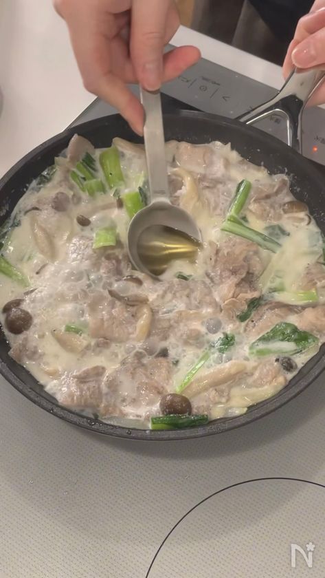 (2) 牛乳、鶏がらの素、胡椒、小松菜を加えて2~3分煮込み、蜂蜜、塩で味を整えたら、盛り付けて完成。