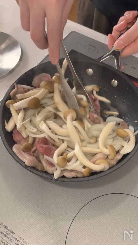 (1) 加熱したフライパンに有塩バターを加え、豚こまを焼く。7割ほど火が入ったら玉ねぎ、しめじを加え炒める。