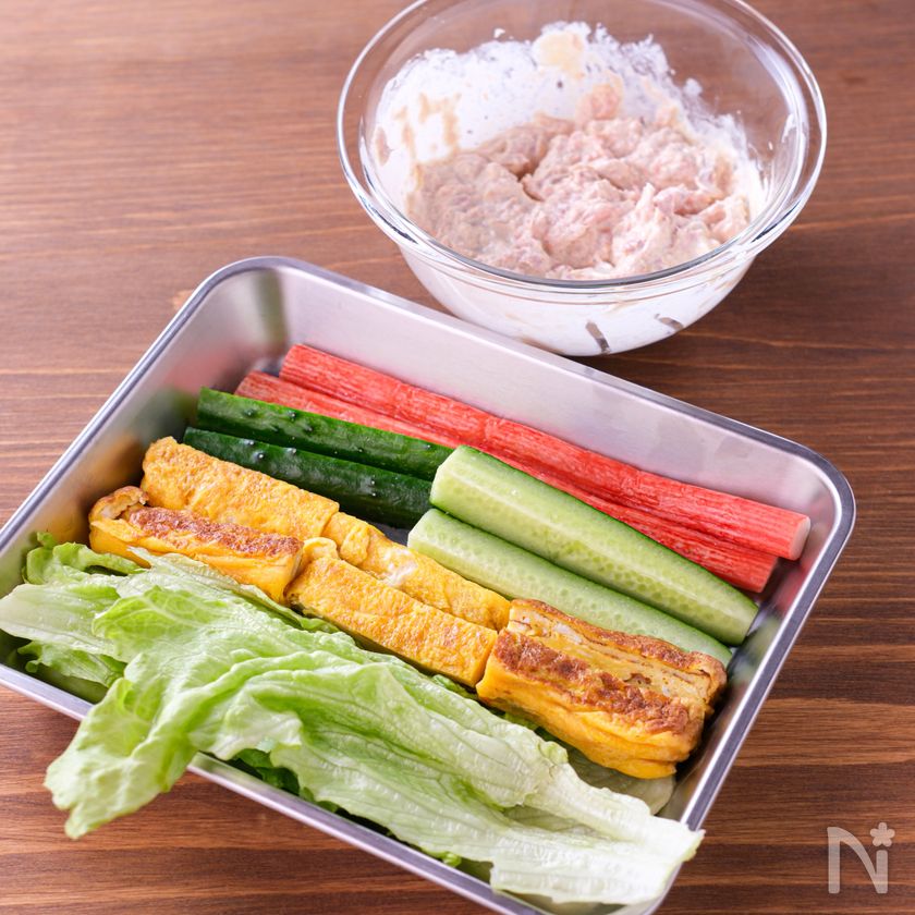 レタスの半量、かにかまロング1本、卵焼きを3個、きゅうり2個、ツナの半量をのせる。