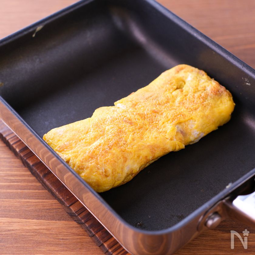 卵焼き器にサラダ油を中火で熱し、卵液を1/4量ずつ加えては巻いていき、卵焼きを作る。