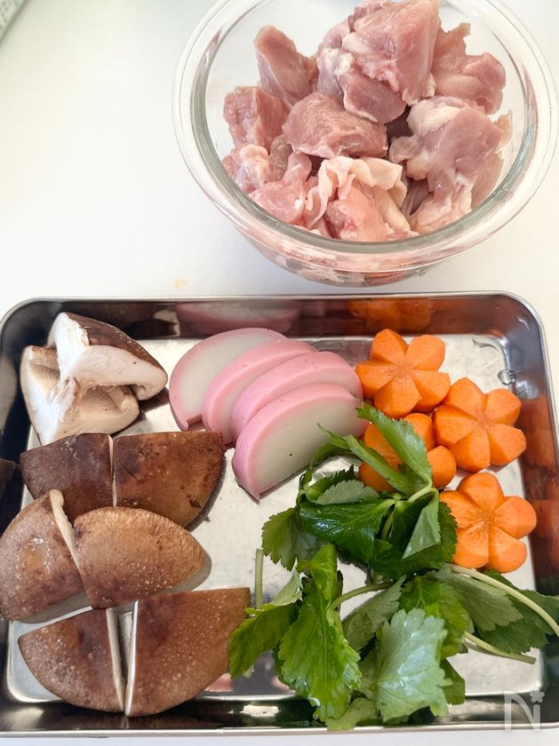 (1) 鶏肉はひと口大にきる。にんじんは5mm幅の輪切りにしたら飾り切りにする。椎茸は4等分にする。かまぼこは薄切りにする。