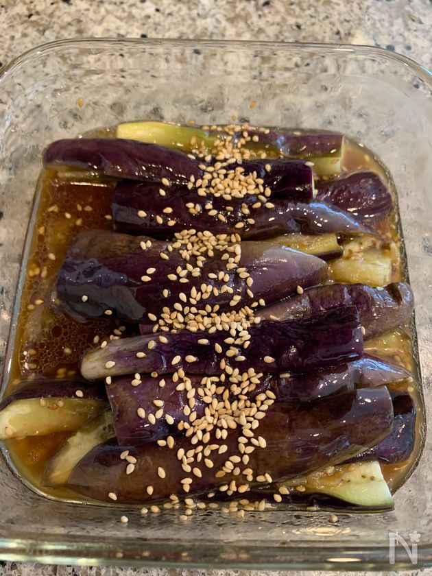(1) 耐熱容器に茄子とサラダ油を入れて混ぜ合わせる。ふんわりラップをして600w3分加熱する。