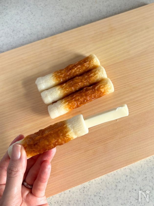 (2) ちくわにチーズを詰め、半分に切る。