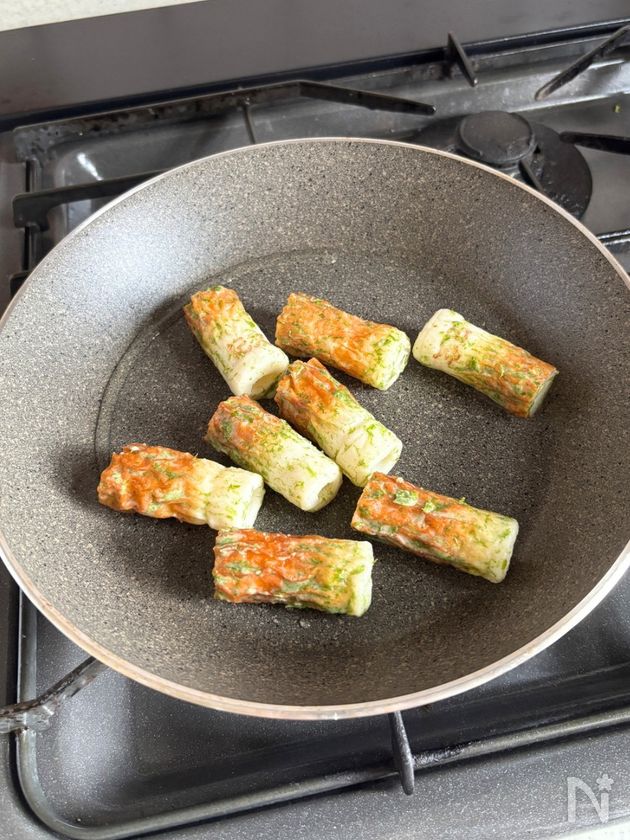 (5) フライパンにサラダ油を中火で熱し、ちくわを転がしながら焼く。