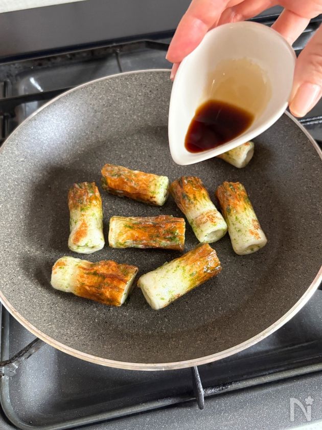 (6) こんがり焼き色がついたら、しょうゆを回しかけて全体に絡める。