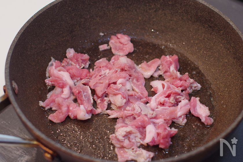(2) ごま油をひいたフライパンを中火で熱し、豚こま肉炒める。