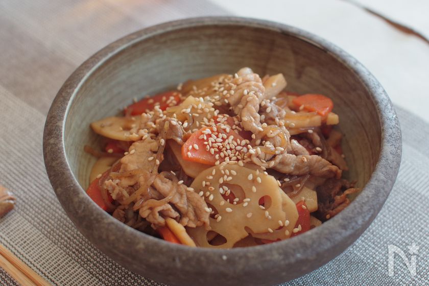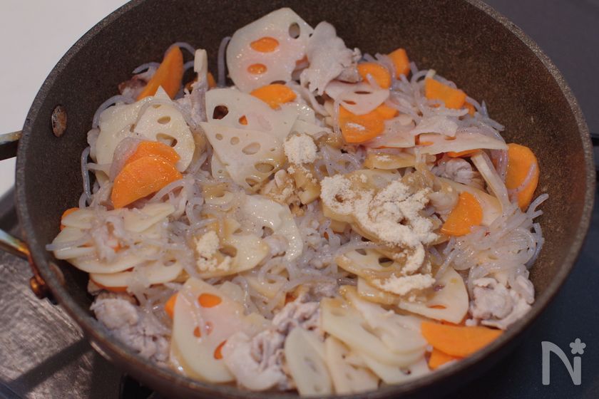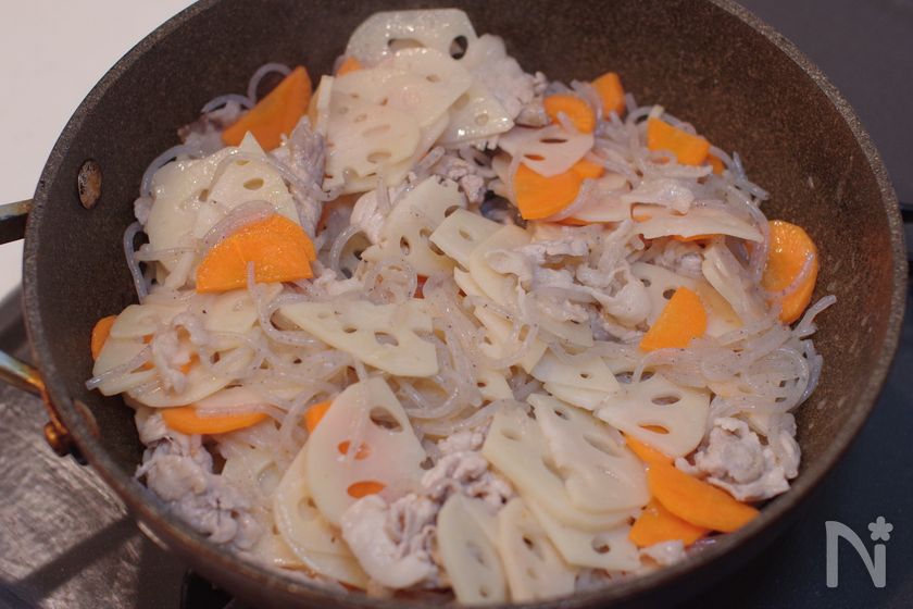 (3) 豚こま肉の色が半分くらい変わったられんこん、にんじん、糸こんにゃくを入れてしんなりするまで5分程炒める。
