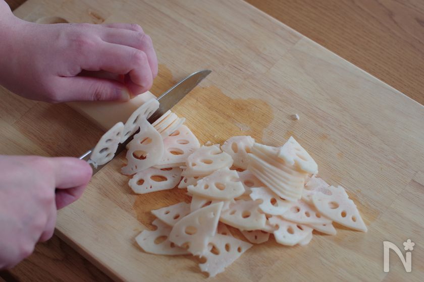 (下準備) れんこんは皮を剥いて縦半分に切って薄くスライスする。にんじんは皮を剥いて薄く半月切りにする。糸こんにゃくは水気をきって食べやすい長さに切る。