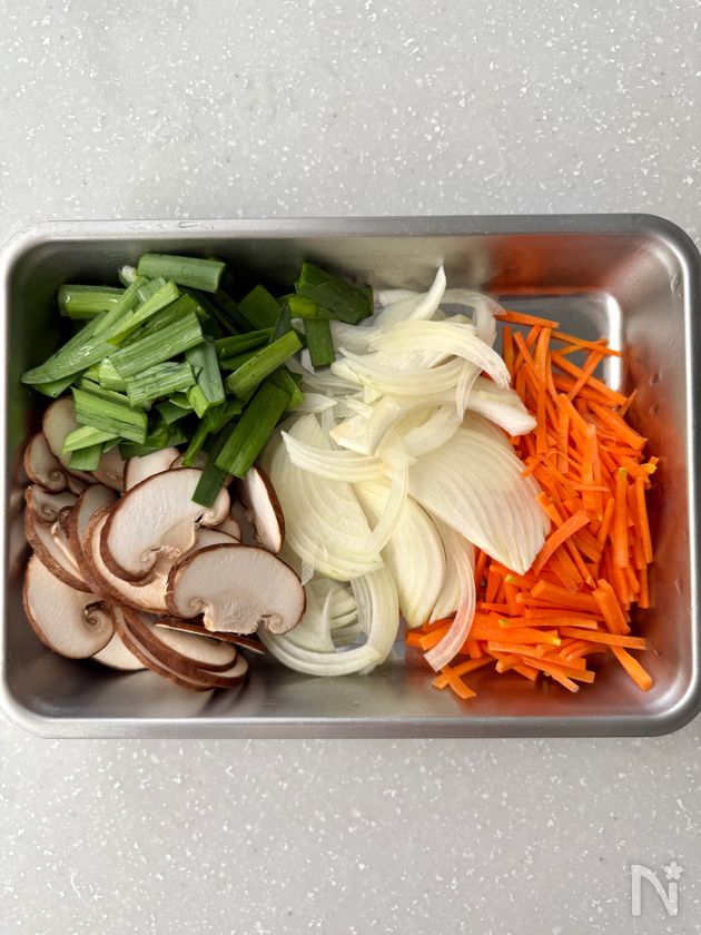 (2) 玉ねぎは薄切り、にんじんは細切りにして耐熱容器に入れ、ごま油小さじ1/2(分量外)をなじませてラップをし、500Wのレンジで3分加熱する。