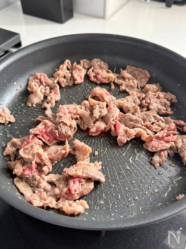 (3) フライパンにごま油、牛バラ薄切り肉、おろしにんにくを入れて点火し、中火で色が変わるまで炒める。