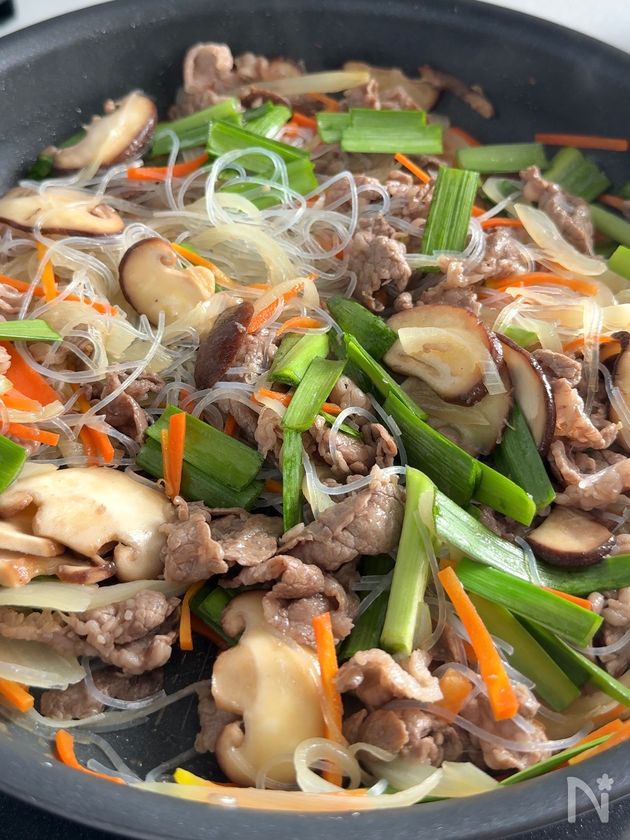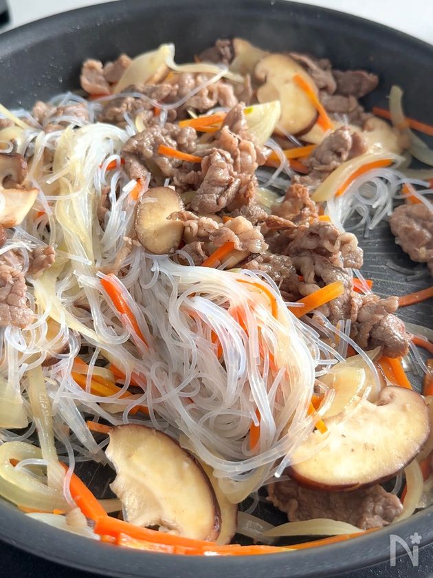 (4) しいたけ、玉ねぎ、にんじんを加えてしいたけがしんなりするまで炒めたら、春雨を加えてさっと炒める。
