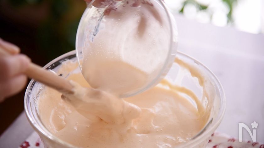 (6) 牛乳とバターを溶かしたものに、生地を少し入れて混ぜます。生地と牛乳バターがなじみやすくなります。バターが冷めて膜が張ったようになっていれば、レンジで5秒程加熱して溶かします。