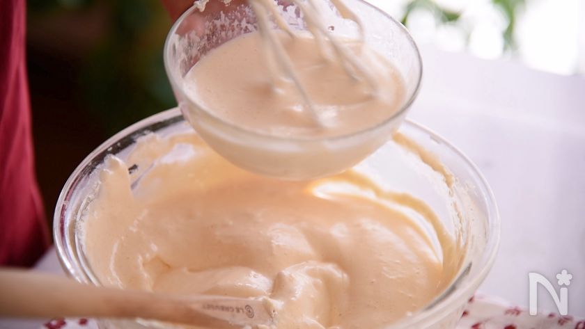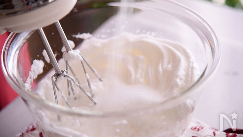 (2) メレンゲを作ります。水分や油分など付いていないボールに卵白を入れて電動ミキサーの高速で混ぜます。しっかりツノが立って、白っぽくこのような状態でツノがしっかり立ちはじめたら【A】を3回に分けて入れ、高速で混ぜます。
