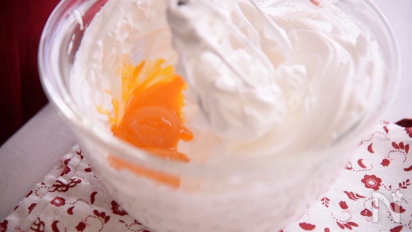 メレンゲを作る時ほんの少しでも卵黄が混じると、メレンゲは出来ません。ボールや手にバターなどの油分がうっかり付かないように。油分や水分が入るとメレンゲが泡立たない。手のハンドクリームなども綺麗に流しておきます。卵は冷蔵庫から出してすぐ作業して大丈夫です!