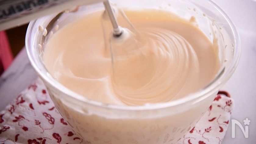 (4) 3分後は黄色っぽい色から、クリーム色になります。更に2分低速でゆっくりボールを回しながら、キメを整えます。持ち上げると形がリボンを描けるようになると出来上り。