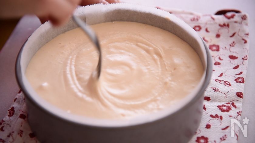 (8) 型にゴムベラでこそげながら流し入れてます。※ボールの底の生地は潰れていて膨らみにくいので型の回りに流し込みます。表面をホークなどでならすと均等に焼き上がります。台の上に3回落として空気を抜きます。