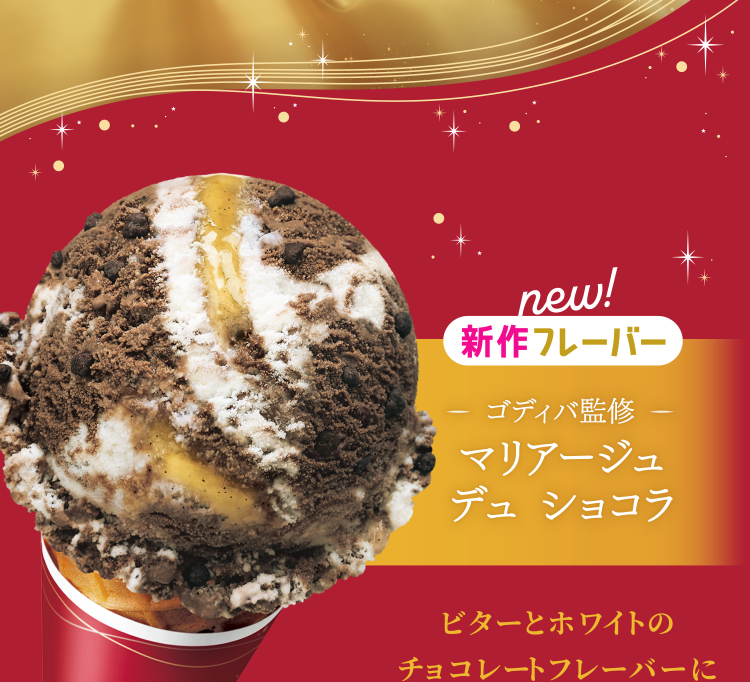 みなさん、今回のゴディバコラボ第2弾はいかがでしたか? 「マリアージュ デュ ショコラ」という名前だけで、もううっとりしてしまいますよね! 昨年の大好評に続くコラボということで、期待も高まります! 年末に向けて忙しくなるこの時期、「ちょっとリッチな甘いもので癒やされたいなぁ」と思うことはないですか? そんな時は、ぜひお近くのサーティワンで、この冬だけの特別なマリアージュを楽しんでみてくださいね! 美味しいアイスでパワーチャージして、素敵なクリスマスシーズンを迎えましょう!