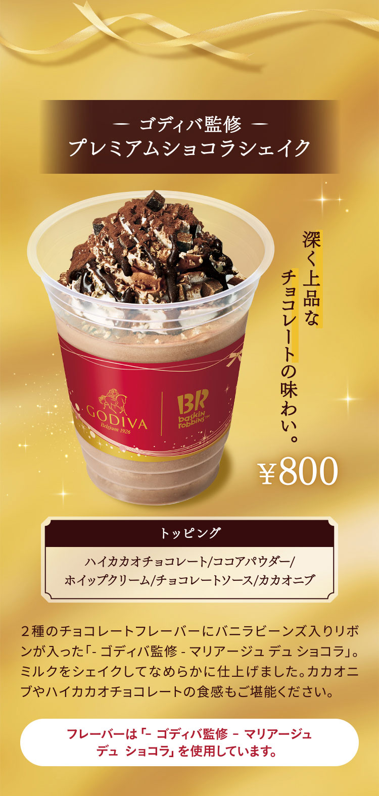 ★ 「プレミアムショコラシェイク」も同時発売! 飲むスイーツ派の方には、ゴディバ監修の「プレミアムショコラシェイク」もおすすめです!濃厚なチョコの味わいを余すことなく楽しめますよ!