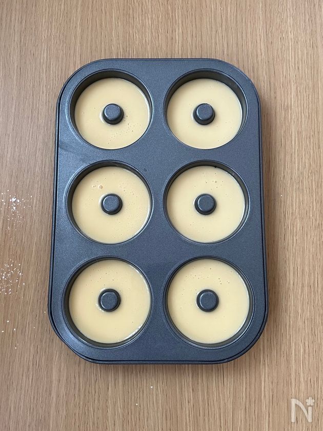 (3) 型に流し入れ、180℃に予熱したオーブンで14分焼く。