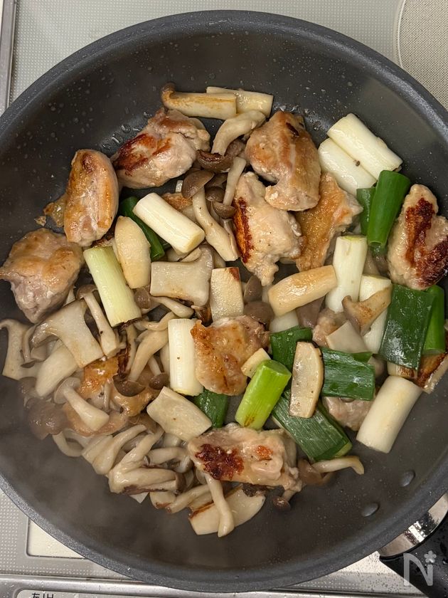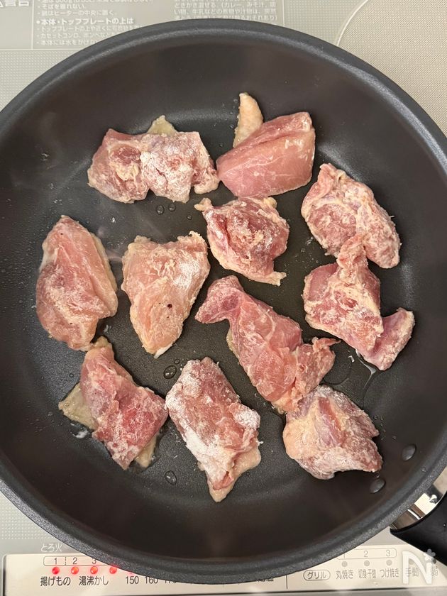 (1) フライパンに、炒め油を小さじ1引き、鶏もも肉を並べ、中火~強めの中火で、焼き色がつくまで焼く。