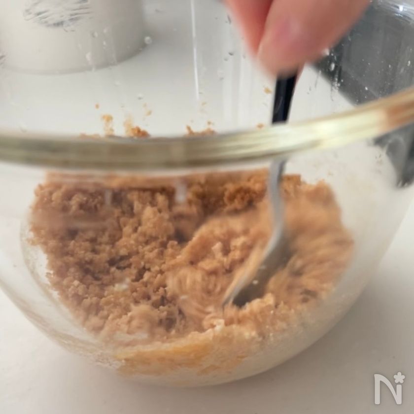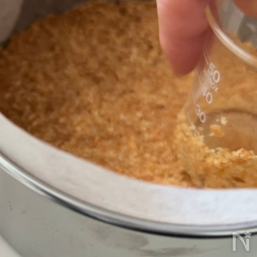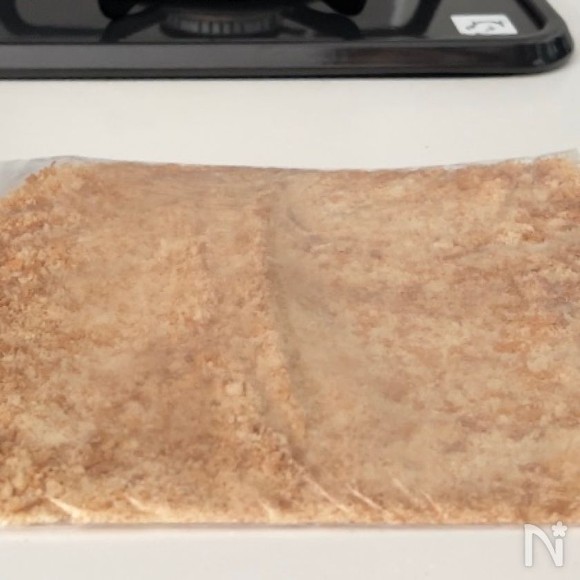 バターと馴染ませしっかり固めるためにビスケットはかなり細かく砕いてください。