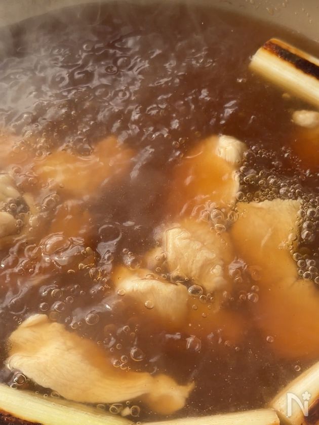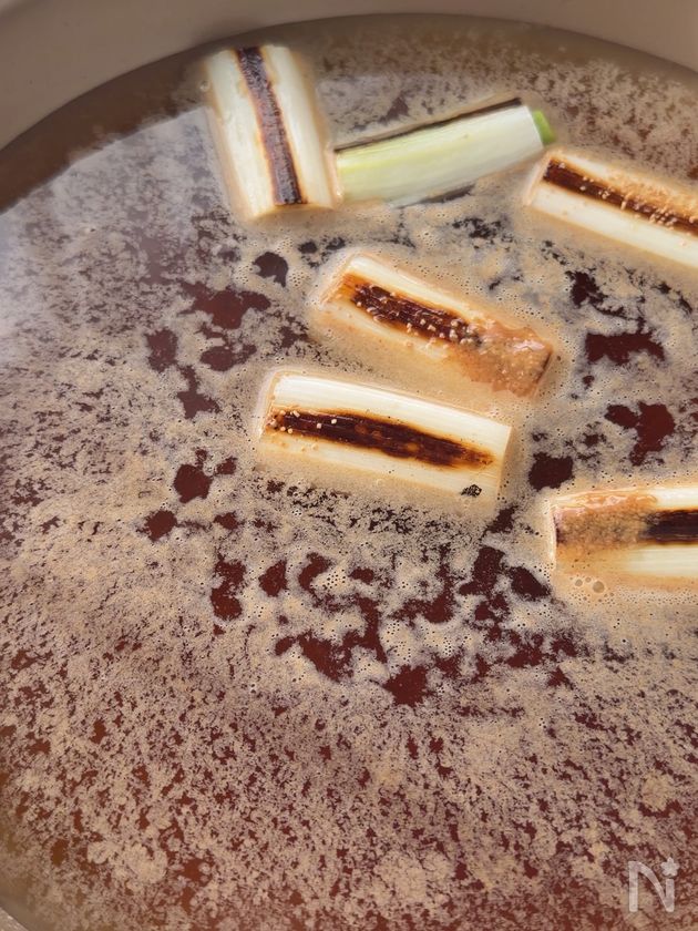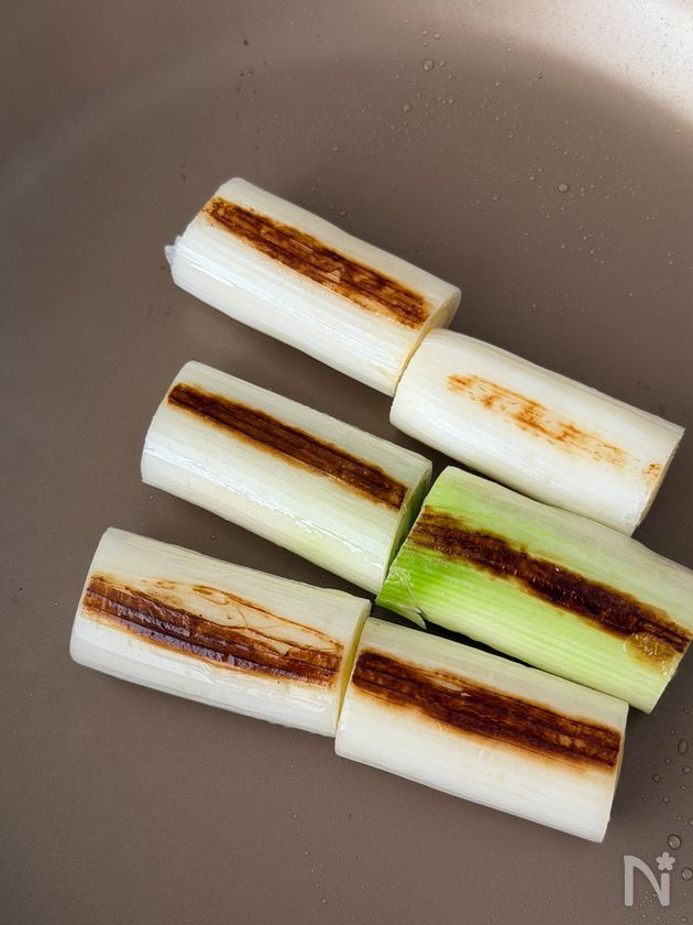 🔶長ネギを焼く時に油を引かないとフライパンが焦げ付いてそのまま出汁を作ると苦味が出るので少し油を引いて焼いて下さい。余分な油は拭き取ってから水を加えて下さい。