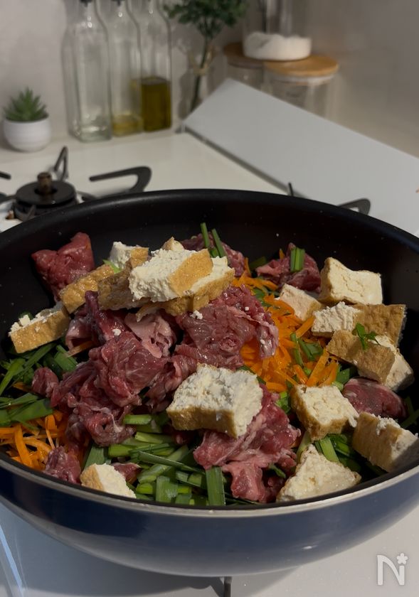 人参は千切り、ニラは3cm幅、牛肉と厚揚げは食べやすい大きさに切っておく。