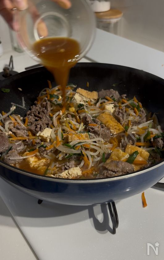 (1) フライパンに、油・もやし・人参・ニラ・牛肉・厚揚げを入れて中火にかける。酒を入れ、蓋を閉めて蒸し焼きにする。(5分程度)